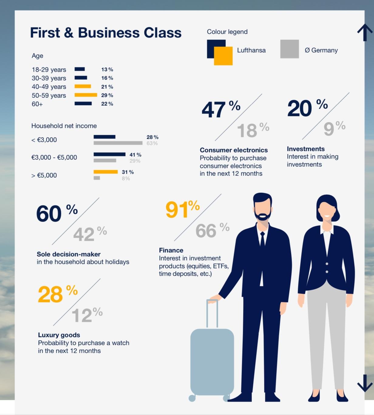 Lufthansa in-flight entertainment system and airport lounges, It reaches an audience of 1.1 million long-haul passengers monthly, distributed across 77 countries. The platform engages a highly valuable demographic, with 56% business travelers and 41% aged between 30-49 years.